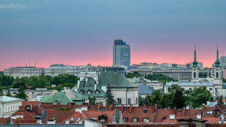 A panorama of Warsaw. A beautiful pink sky on the horizon. Roofs covered with ceramic tiles and copper sheets. The capital of Poland.