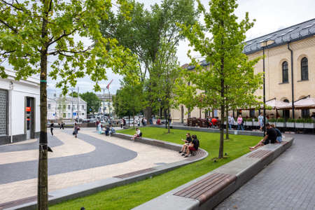Moscow, Russia - 23 Jul 2020: General landscape view at tradition Moscow architecture. City life on the central streets of the city. The citizens go on their own business. Automobile traffic.