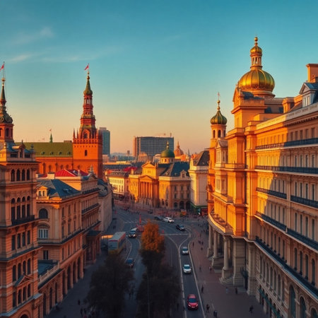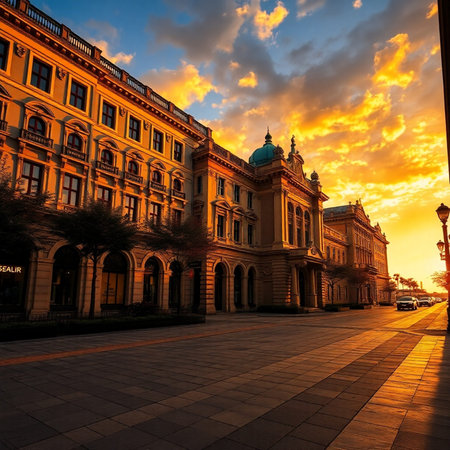 Sunset reflecting on one of the main streets in Lviv, Ukraine
