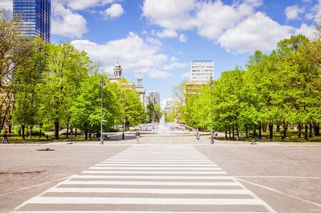 Lodz, Poland - June 23 2019: View from Liberty Square to Piotrkowska street. Sunny day, blue clear sky