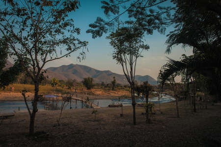 Long exposure photography with grain. Asian man wearing a long-sleeved shirt, sneakers SelfieTake picture by yourself Stand and see the views with valleys and rivers. at MEA TEEP Lamphun in Thailand
