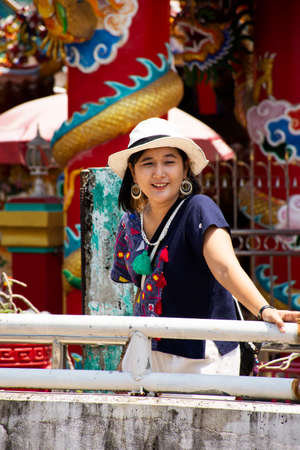 Asian travelers thai women people wearing hat white color travel visit respect praying angel deity god buddha in Chinese shrine of Wat San Chao temple or Wat Makham pagoda in Pathum Thani, Thailand