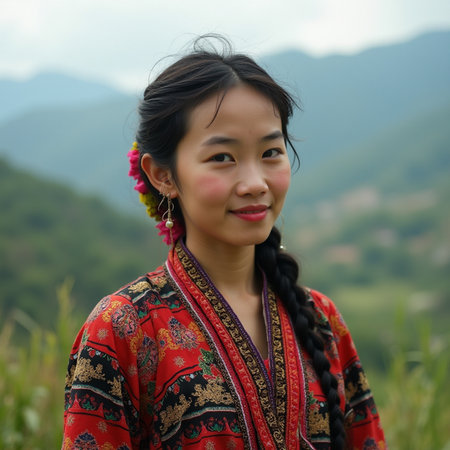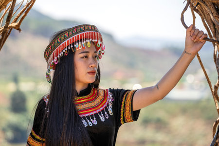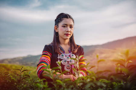 Hmong hill tribe clothes. Beautiful young asian lady Akha hill tribe in Thailand.