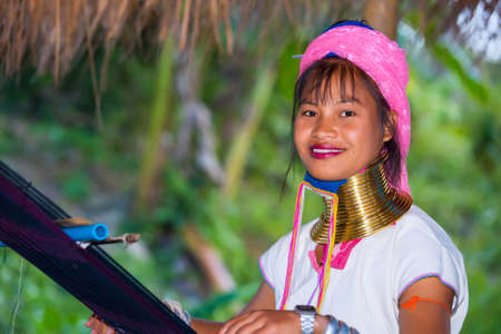 Portrait of Long Neck Woman weave cloth in front her house in tribal village Northern Thailand.