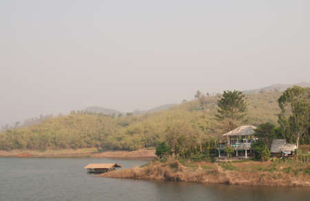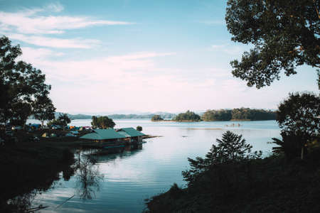View of a lake with a house, Bright sky, vajiralongkorn dam