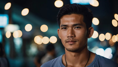 A young man stands confidently in a bustling night market in Thailand, surrounded by soft, glowing lights. His thoughtful expression contrasts with the lively atmosphere around him.
