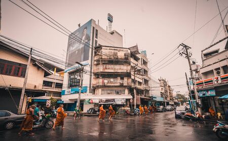 Ratchaburi,Thailand - November 6, 2017 : Monk walking along road to alms round in raining day