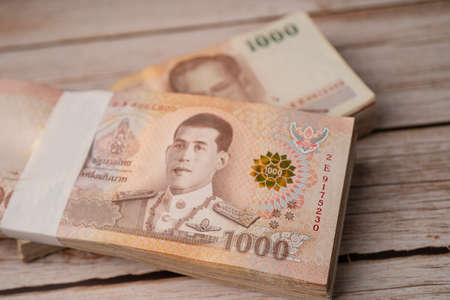 Stack of Thai baht banknotes on wooden background, business saving finance investment concept.