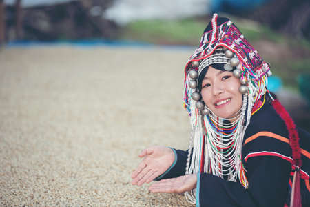 Akha women smiled and admired the coffee that was dried in the house, the hill tribe coffee products of northern Thailand.