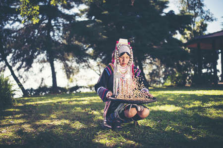 Akha using a winnowing basket separating arabica coffee from shell, Akha in the north of Thailand enjoying with job, Akha was separating coffee from shell by bamboo basket with traditional cloth.