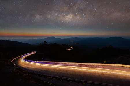 Aerial view of cars driving on curved, zigzag curve road or street on mountain hill with green natural forest trees in rural area of Nan, Thailand. Transportation.