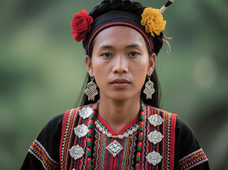 A close-up portrait of a Dayak woman wearing a richly embroidered traditional outfit. She has a composed expression and wears intricate silver earrings. Her black hair is adorned with a red and yellow flower, and a feathered ornament. The background is softly blurred, highlighting her cultural attire.