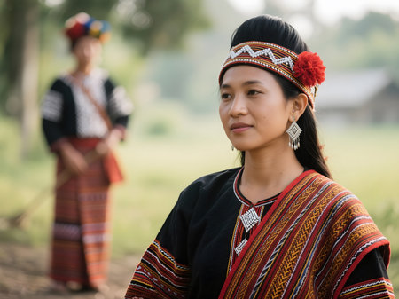 A Dayak woman stands outdoors wearing a detailed traditional outfit with a geometric-patterned headband and red flower. Her earrings and chest ornament feature silver detailing. Another person in similar attire is visible in the soft-focus background. The scene captures cultural pride and natural beauty.