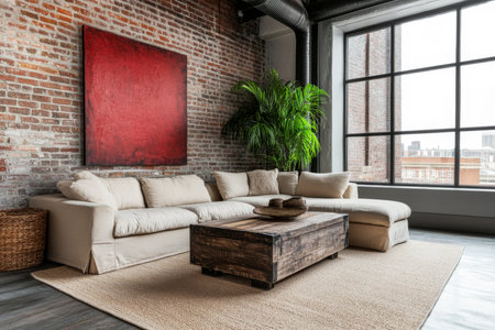 The image showcases a spacious, modern loft with exposed brick, large windows, and a minimalist design, perfect for architecture, interior design, or lifestyle advertising.