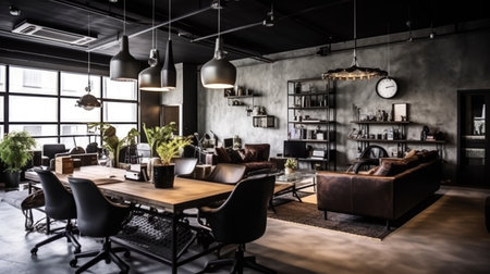 Inspiring office interior design Industrial style Lounge featuring Exposed pipes architecture. Generative AI AIG 31.