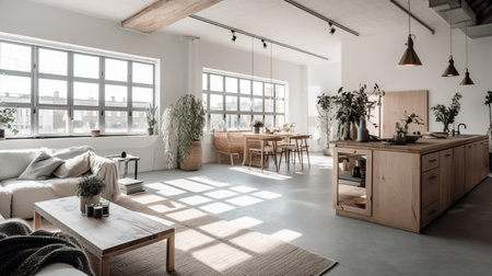 The interior of the room is loft-style. A room lit by light from a window. AI generated.