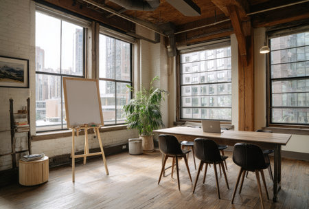An interior shot showcases a well-lit office space featuring a large wooden table surrounded by chairs, positioned near expansive windows. A blank easel stands in the foreground, while natural light floods the room. This adaptable scene suggests versatility for various business or editorial applications.