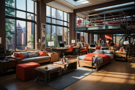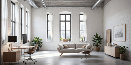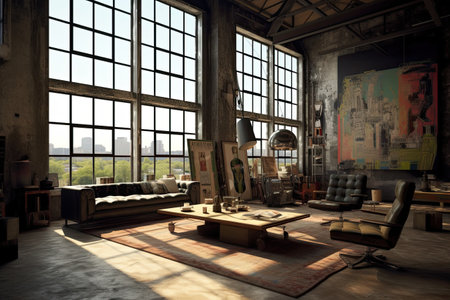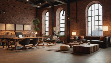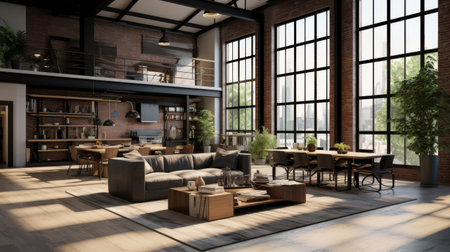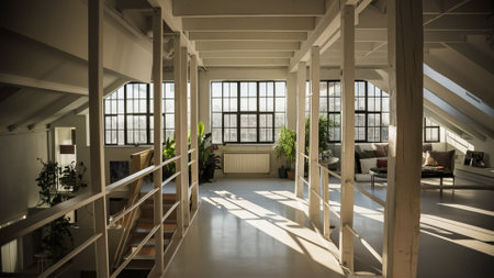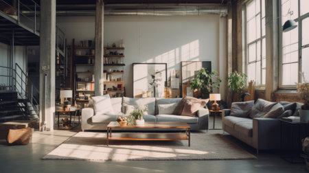 Bright and spacious modern loft interior featuring industrial design elements. The space boasts large windows and wooden beams, perfect for creativity.