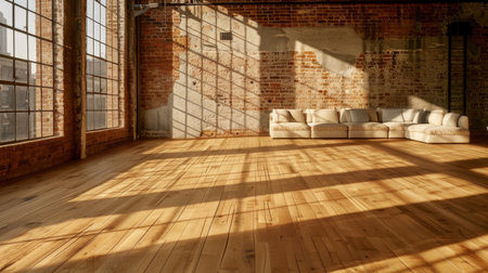 Spacious industrial loft features large windows allowing natural light to flood room, casting shadows on warm wooden floor. cozy white sofa invites relaxation in this stylish setting