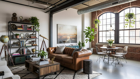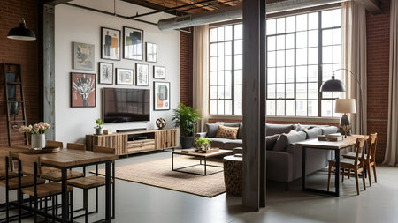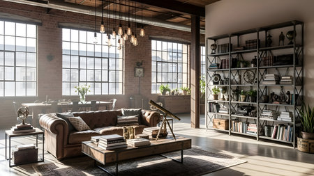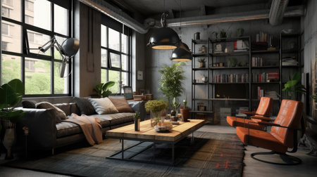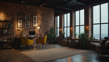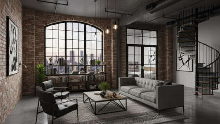 Modern living space with large windows and stylish furniture in a cozy urban loft setting
