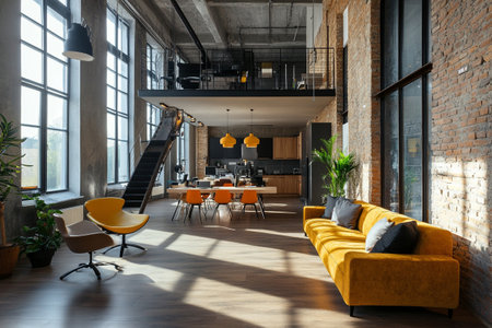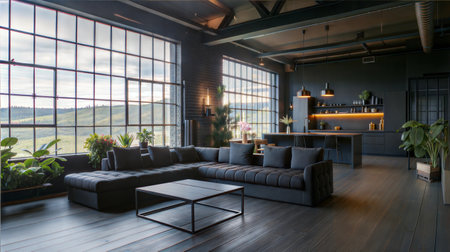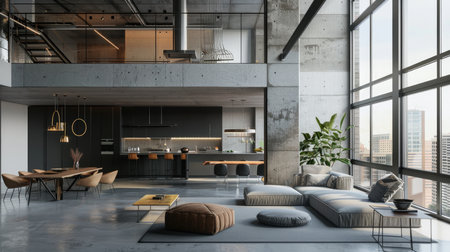 Stunning modern loft apartment with industrial design elements. Features open plan living, large windows, and stylish furniture.