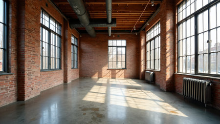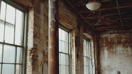 Explore the beauty of a rustic industrial interior featuring weathered brick walls and large windows, showcasing an abandoned warehouse's unique charm.