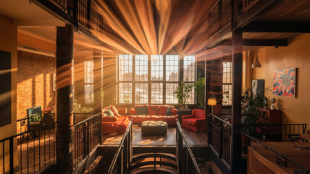 The interior of the room is loft-style. A room lit by light from a window. AI generated.