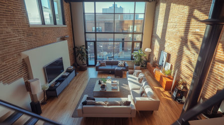Urban loft with exposed brick high ceilings and industrial windows flooded with natural light
