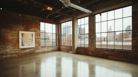 Bright and spacious modern loft with large industrial windows and exposed brick walls, perfect for artistic showcases or creative events in an urban setting.