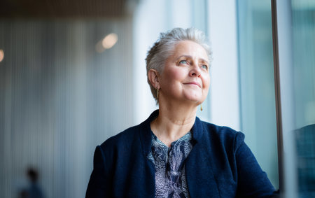 A mature woman stands by a large window in a modern building. She looks thoughtful while sunlight shines on her face. People can be seen in the background, highlighting a busy environment.