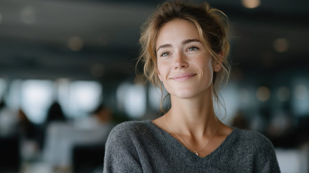 Smiling businesswoman portrait in open office environment ideal for team success concepts HR branding recruitment and corporate communications.