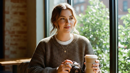 A woman with curly hair sits near a window, gazing thoughtfully at the city outside. Soft light fills the room. She appears to be lost in her thoughts.