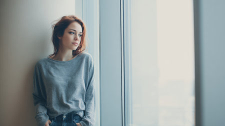 A young woman dressed in a casual outfit stands by a window, lost in thought. The modern interior is filled with natural light, creating a serene atmosphere.