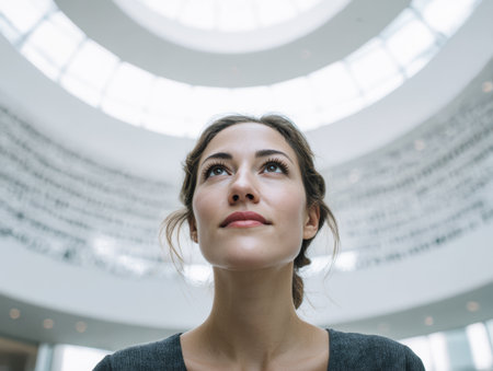 A woman stands inside a modern art museum, looking up with curiosity. Light streams through the high ceilings, illuminating the simple walls. Visitors wander in the background.
