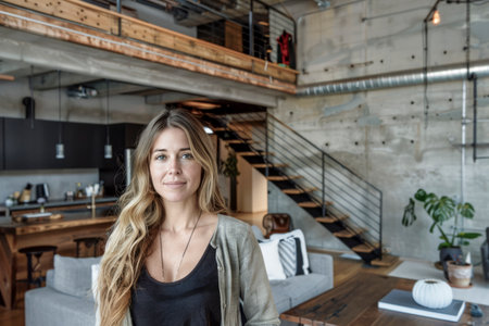 Smiling woman with long blonde hair in a modern industrial loft, featuring wooden accents, open-plan design, and stylish furniture