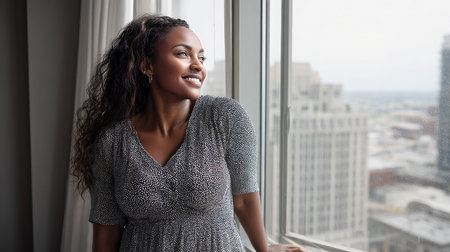 A curvy woman standing by the window of a high-rise apartment, smiling and looking out over the city.