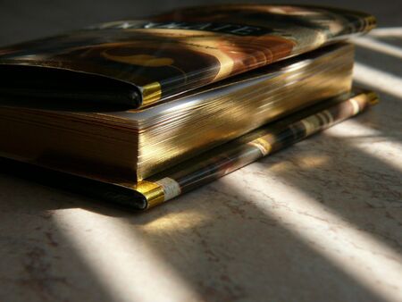 Small book laying on a table illuminated in stripes