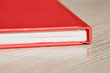 Close-up of new closed red book on wooden table. Literature, education, reading concept.