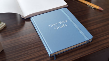 Blue journal with New Year Goals on a wooden desk with pencil and open book