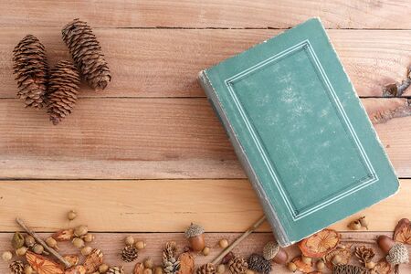 autumn background. cones,acorns and pieces of wood with an old book on a wooden background. the view from the top.