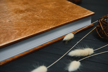 Family photo book with embossing. Photo book on a wooden background. Brown photo book with wood cover. Photoalbum with a hard cover. wedding photo album.