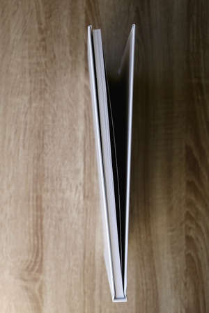 Side view close up of thick and rigid wedding album pages in a book. Blank empty room space for text or copy.