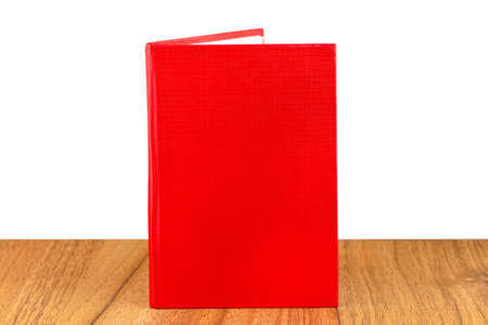 Slightly opened red lined notebook standing on a wooden table, isolated on a white background.