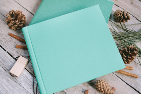 The blue book on a wooden background with cones and cinnamon. The big book on wooden boards. Wooden flash card.