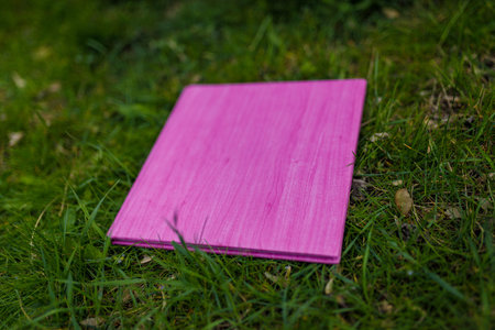 Book, album, notebook or photobook with purple leather cover lying among green grass. Soft focused shot.