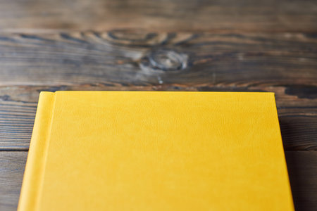 Book with yellow leather hardcover isolated on a brown wooden background. Closeup first person POV. Book, photo album, diary, planner or scrapbook is about to be opened.