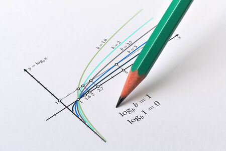 Pencil and several logarithmic functions with different bases plotted on bright background
