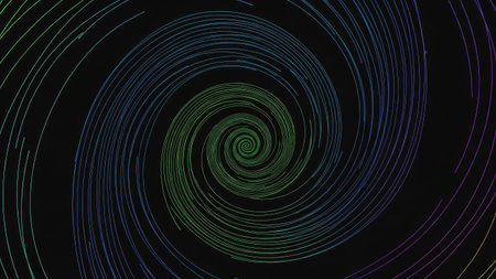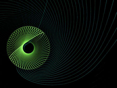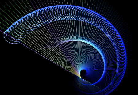 An abstract image depicts a spiral pattern created with curving lines, featuring a gradient of green and blue hues. The design is set against a dark backdrop, with a focus on lines and their formation. Suitable for various design projects, this image could be used for backgrounds or creative elements.