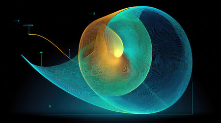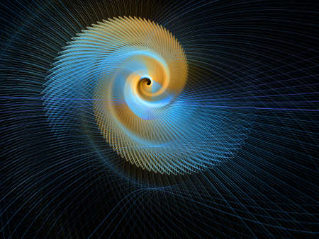 An abstract digital illustration presents a swirling spiral composed of interconnected lines. The artwork features vibrant shades of blue, yellow, and green, creating a dynamic visual effect. The dark background enhances the luminosity of the shapes, and could be utilized for various commercial and editorial projects.