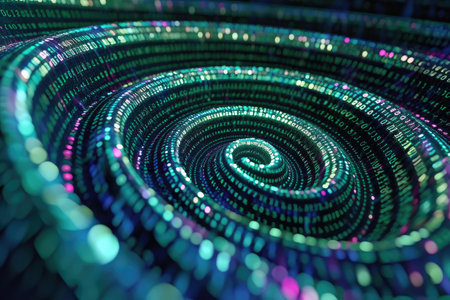 This photo captures an abstract image featuring a visually striking spiral formed in shades of blue and green, Binary code arranged as hypnotic spiral pattern, AI Generated